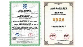 The company has successively obtained the National Industrial Product ProductionLicense, CCC National Compulsory Certification, ISO9001: 2016 International Quality System Certification, ISO14001: 2016 Environmental Management System Certification, GB/T45001-2020 Occupational Health and Safety Management System Certification, and won the Honorary Titles such as "Top 100 Chinese Wire and Cable Enterprises with Comprehensive Strength", "National Quality and Integrity AAA Brand Enterprise", "Contract-abiding and Trustworthy Unit", "China Wire and Cable Industry Customer Satisfaction Enterprise".